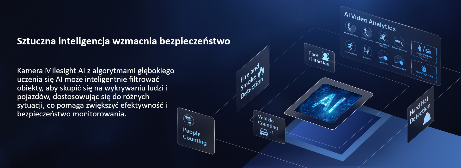 • Analiza treści wideo oparta na sztucznej inteligencji, zliczanie obiektów (przekroczenie linii przez osoby/pojazdy, osoby w danym regionie), wykrywanie twarzy