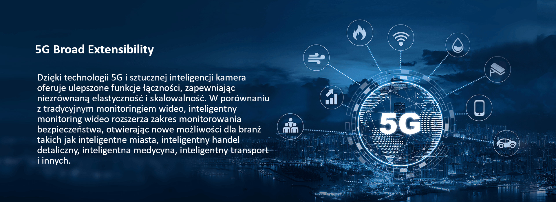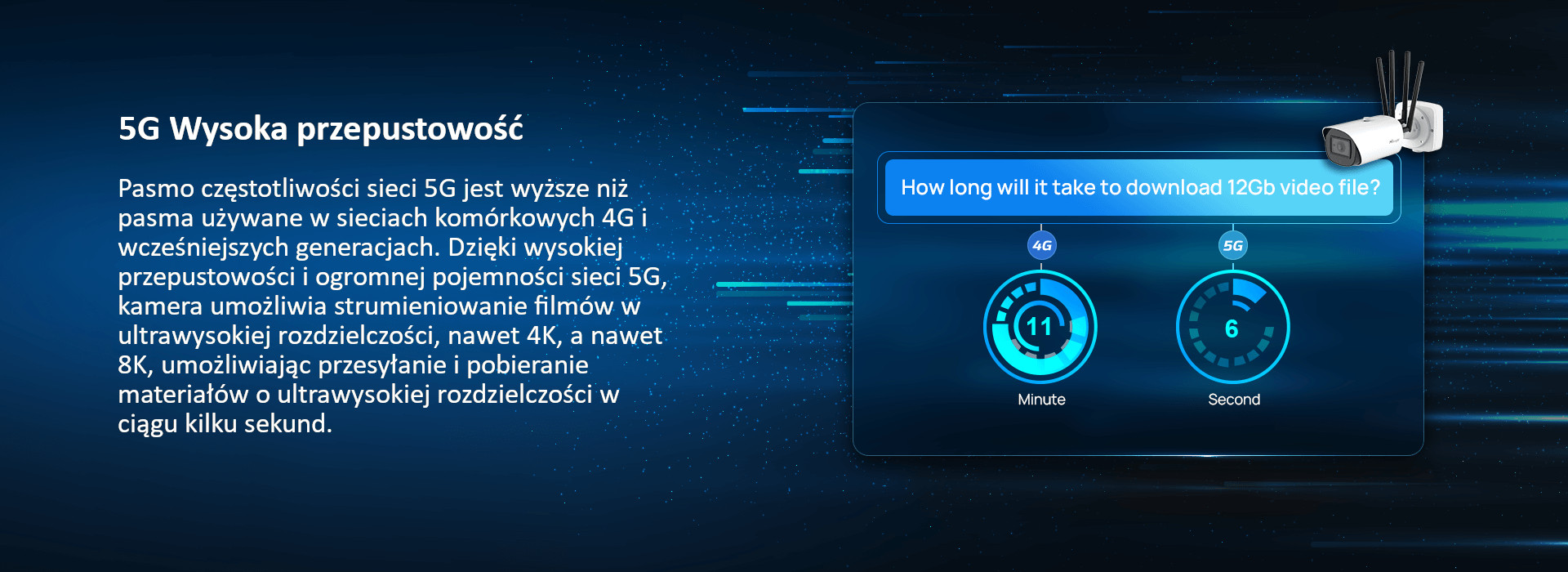 Technologia 5G różni się od poprzednich generacji technologii komórkowej tym, że czas reakcji wymagany do przesłania zestawu danych między dwoma punktami jest znacznie skrócony. Korzyścią płynącą z wyższej prędkości transmisji danych technologii 5G jest znaczne skrócenie opóźnień sieci i czasu reakcji kamery, co zapewnia płynny monitoring w czasie rzeczywistym, praktycznie bez opóźnień.