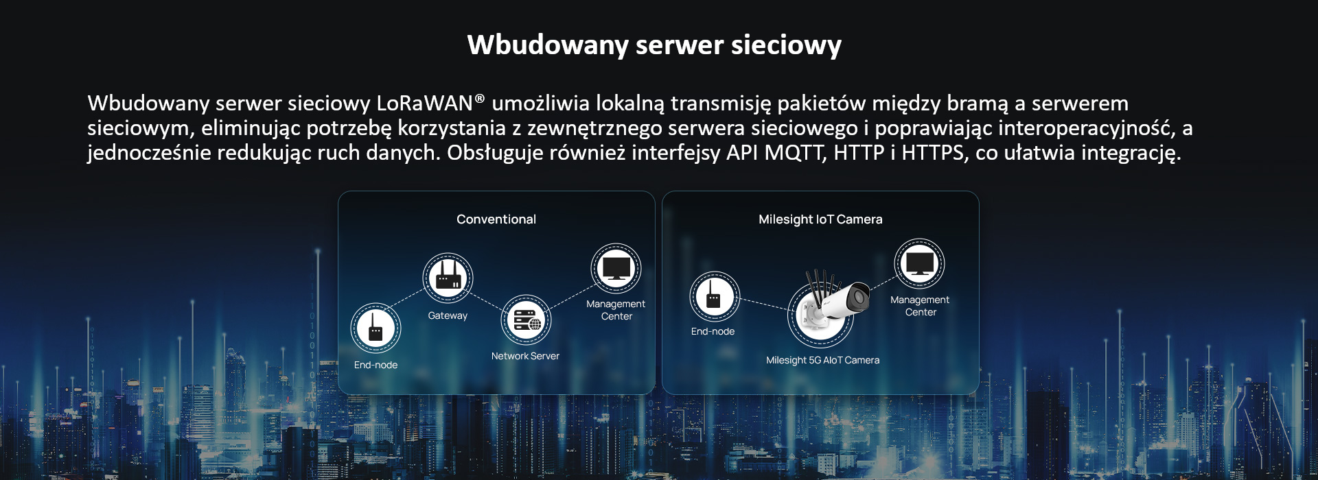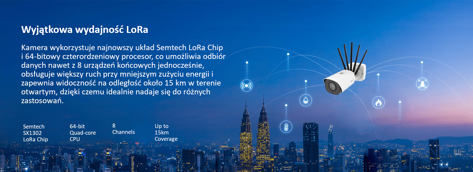 Kamera może komunikować się z urządzeniami końcowymi korzystającymi ze standardowego protokołu LoRaWAN® i przesyłać zaszyfrowane dane. Obsługiwany jest globalny plan częstotliwości LoRaWAN®, który spełnia zróżnicowane wymagania regionalne, w tym CN470/RU864/IN865/EU868/AU915/US915/KR920/AS923.