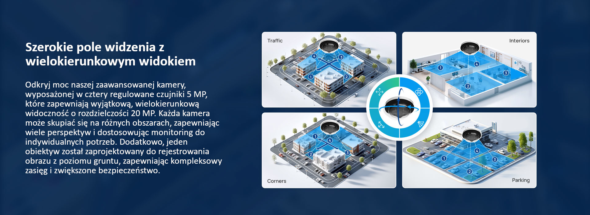Kamera multisensorowa 360o z czterema niezależnymi zmotoryzowanymi obiektywami po 5MP każdy, to zaawansowane urządzenie, które zapewnia pełny, panoramiczny widok otoczenia w wysokiej rozdzielczości. Dzięki swojej konstrukcji, jest idealnym rozwiązaniem do monitoringu obiektów o złożonej geometrii, takich jak skrzyżowania, parkingi czy hale produkcyjne. Szeroki kąt widzenia pozwala na objęcie całości przestrzeni jednym urządzeniem, eliminując konieczność instalowania wielu kamer.