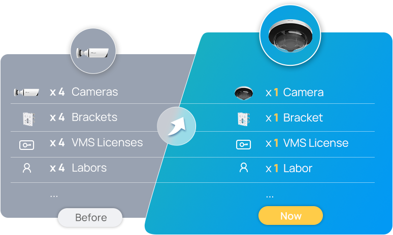 Wielokierunkowa kamera Milesight została zaprojektowana tak, aby zastąpić do czterech tradycyjnych kamer, zmniejszając liczbę urządzeń potrzebnych do pełnego pokrycia. Oznacza to mniej kamer, mniej uchwytów i mniej skomplikowaną instalację – oszczędzając czas i pracę. Dodatkowo, dzięki mniejszej liczbie kamer, obniżą się również koszty licencji VMS i konserwacji.