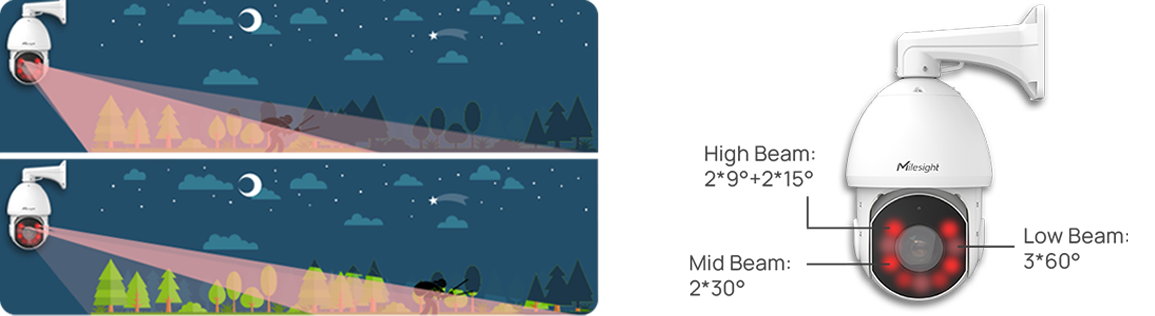 Tworząc model 3D w zasięgu monitorowania, kamery PTZ Milesight oznaczają i śledzą obiekt po wykryciu i wybraniu celu, aby zapewnić stałe proporcje obiektu i doskonałe widoki śledzenia poprzez automatyczne sterowanie kierunkiem i poziomem zoomu.