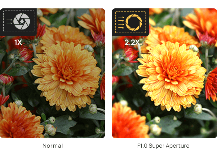 Superduża przysłona F1.0 przepuszcza 2,2 razy więcej światła niż standardowe aparaty, co znacznie poprawia ekspozycję obrazu. W warunkach słabego oświetlenia gwarantuje ona stałą i doskonałą jakość obrazu.