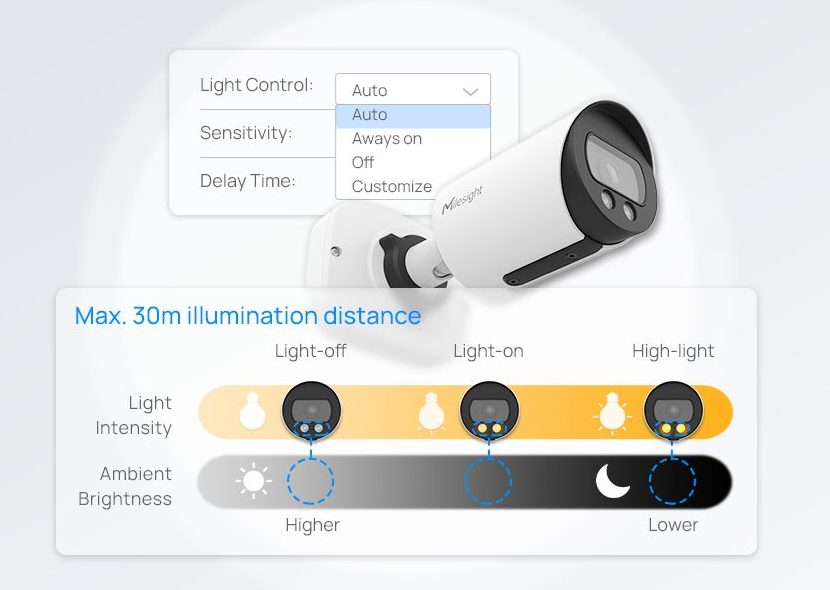 Inteligentny oświetlacz ma maksymalny zasięg oświetlenia 30 metrów i może automatycznie regulować natężenie oświetlenia dodatkowego w zależności od warunków otoczenia, zapewniając elastyczne rozwiązanie do monitorowania i kontroli.