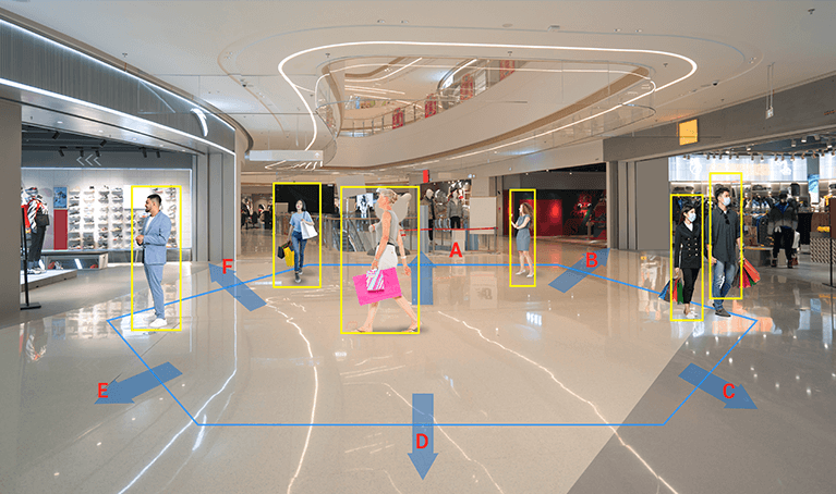 Funkcja Milesight People Flow Analytics umożliwia analizę do 6 różnych kierunków przepływu osób w oparciu o śledzenie w czasie rzeczywistym, co pozwala na planowanie przestrzeni i podejmowanie decyzji biznesowych.