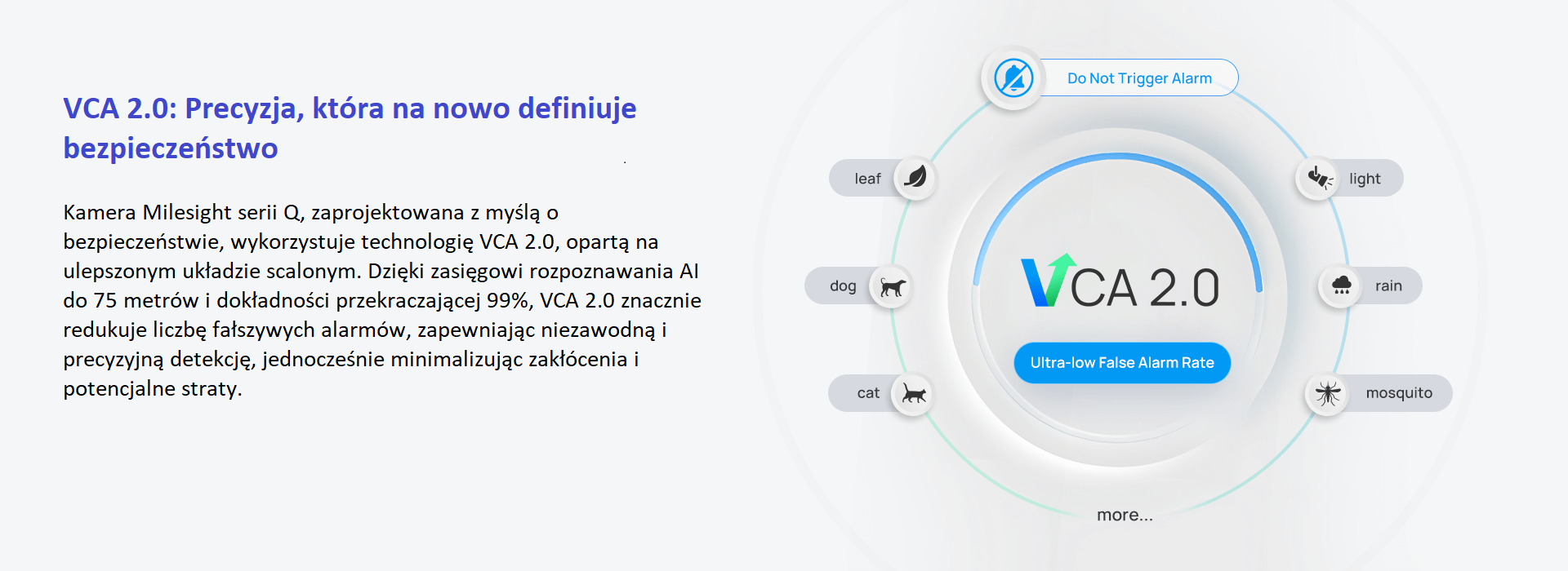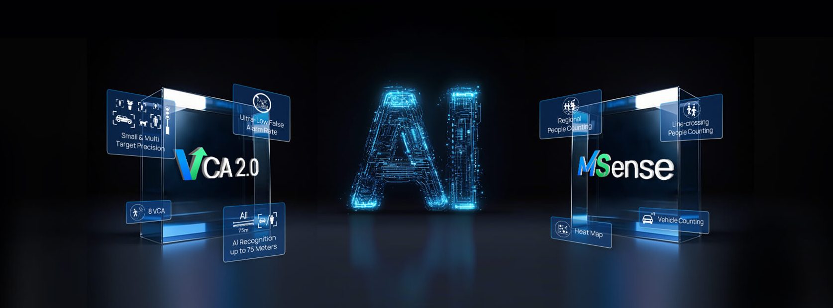 Skoncentrowany na klasyfikacji osób i pojazdów z wykorzystaniem głębokiego uczenia, pełen pakiet AI VCA 2.0 zapewnia wyjątkowo niski wskaźnik fałszywych alarmów, obsługuje detekcję z dużej odległości do 75 metrów, rozpoznawanie wielu celów i wykrywanie małych obiektów, zapewniając solidne bezpieczeństwo fizyczne. Jednocześnie MSense oferuje inteligentną analizę trendów dostosowaną do zastosowań w branży pionowej.