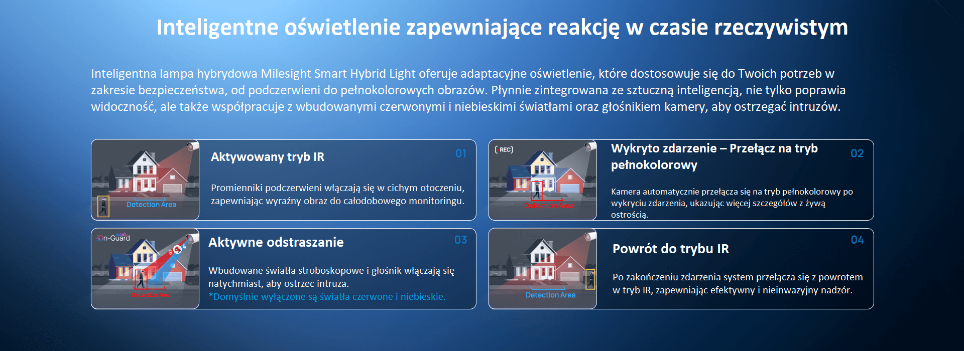 W połączeniu z VCA 2.0 i analityką MSense, system automatycznie przełącza się z trybu podczerwieni na tryb TrueColor po wykryciu ruchu człowieka lub pojazdu. Czerwone i niebieskie migające światła, w połączeniu z dwukierunkową transmisją dźwięku, zapewniają wizualne i dźwiękowe odstraszanie w czasie rzeczywistym, gwarantując proaktywne zapobieganie włamaniom.