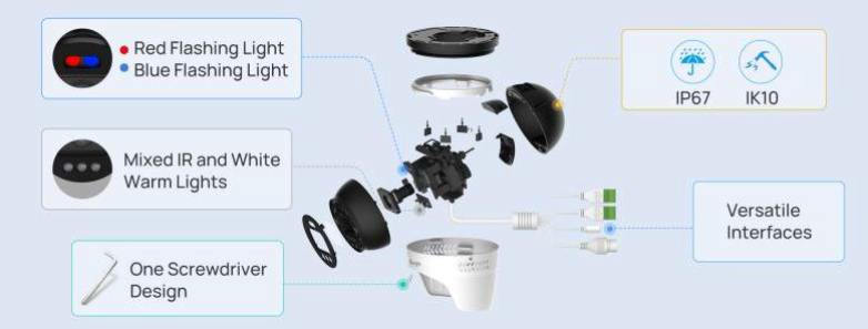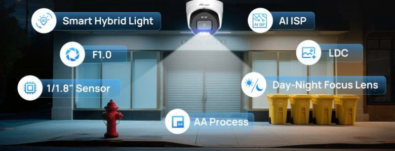 Dzięki dużej matrycy, szerokiej przysłonie, podczerwieni 40 m i białemu, ciepłemu światłu 30 m, kamera, w połączeniu z zaawansowaną technologią AI ISP i korekcją UTL, zapewnia jasne obrazy o niskim poziomie szumów i ulepszonych szczegółach w cieniach, gwarantując prawdziwie pełne kolory nawet w trudnych warunkach oświetleniowych.