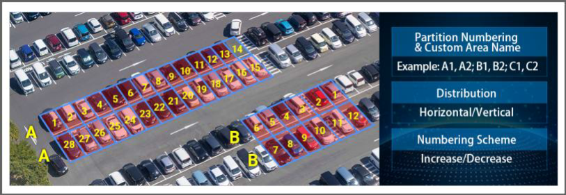 Konfiguracja wykrywania miejsc parkingowych jest niezwykle elastyczna i wygodna. Użytkownicy mogą łatwo dostosować nazwę obszaru, jego rozkład i schemat numeracji obszarów wykrywania w zależności od potrzeb. Dodatkowo, zajęte miejsca parkingowe są oznaczone kolorem czerwonym, co intuicyjnie wskazuje status zajętości każdego z nich.