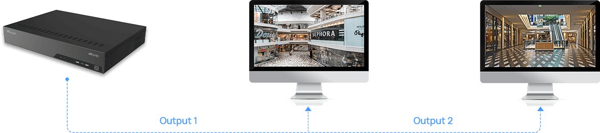 Wielokanałowe wyjście wideo można uzyskać na dwa sposoby: niezależne wyjścia umożliwiają niezależne wyświetlanie różnych kanałów na wielu wyświetlaczach, natomiast wyjścia synchroniczne synchronizują wyświetlanie tego samego kanału w różnych lokalizacjach.