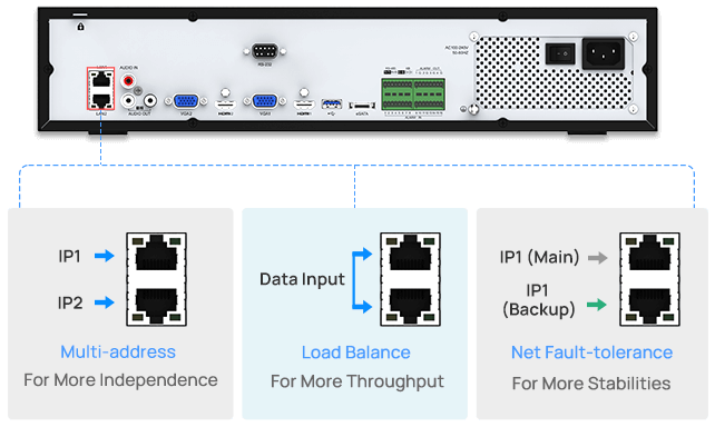 Rejestrator Milesight 4K H.265 Pro NVR serii 8000 jest wyposażony w szereg portów, takich jak port HDMI, port VGA, 3 porty USB, wejście/wyjście alarmowe, wejście/wyjście audio oraz 2 porty LAN. Pełen zestaw interfejsów zapewnia wszystkie niezbędne funkcje do efektywnego monitoringu.